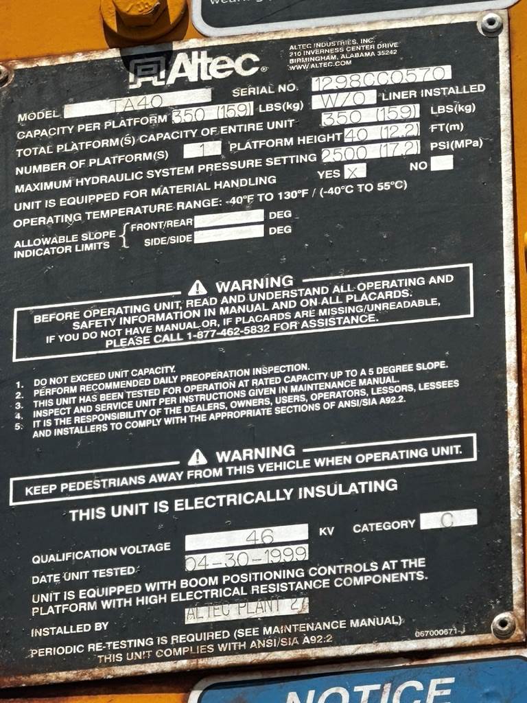 1999 International 4900 Bucket Truck - Altec TA40 Bucket, DT466E Engine, Automatic Transmission, ODO Reads: 272,240, ALTEC TA40 Bucket Lift, Everything Works Great, Truck Runs and Drives Great.